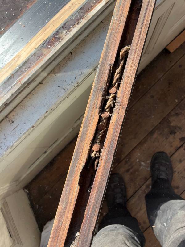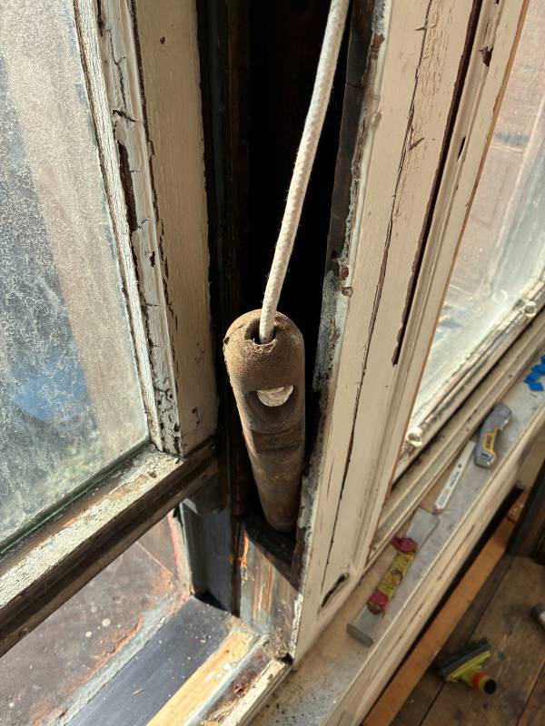 When cords are renewed the pulleys are serviced, weight chambers cleared of debris, cord grooves on the sashes are cleared of old cords and nails, then the windows are fully re-assembled and tested.